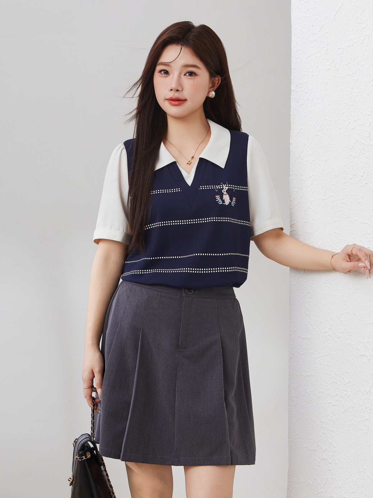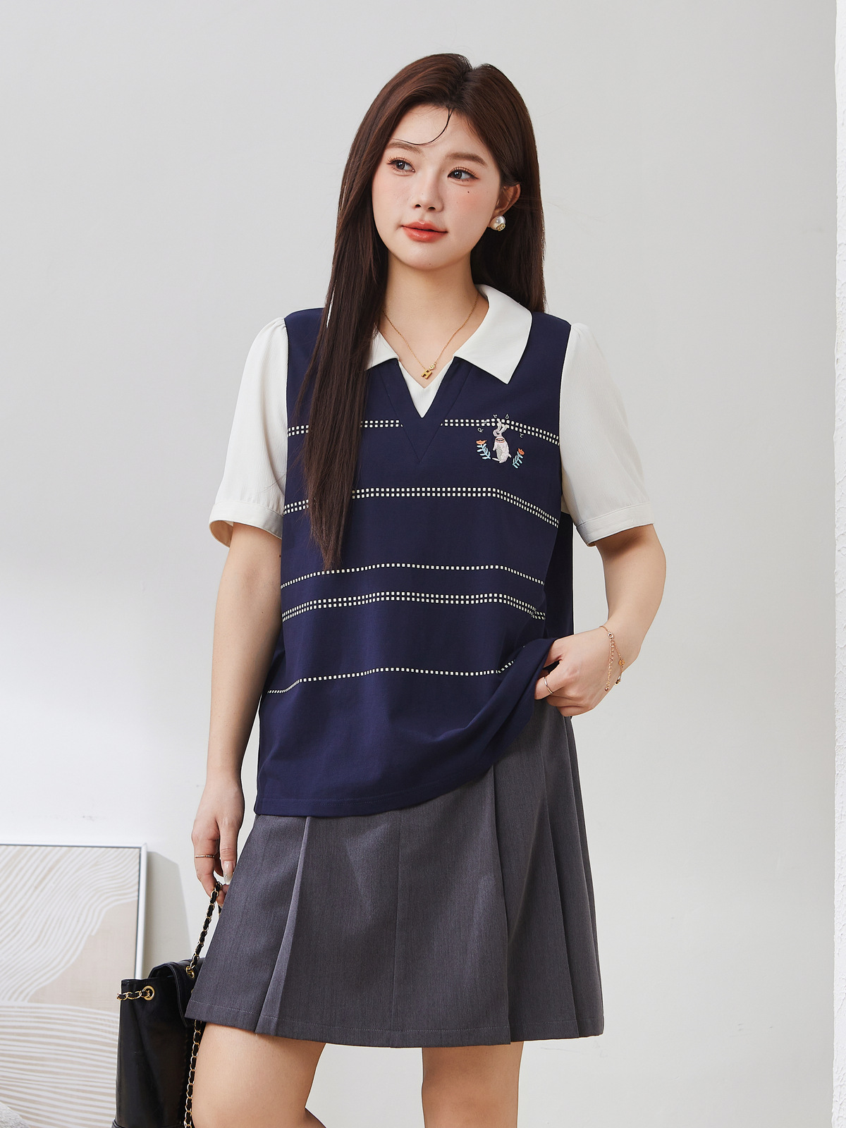 Preppy Style Embroidered Patchwork Color-Block Top EXZ2683