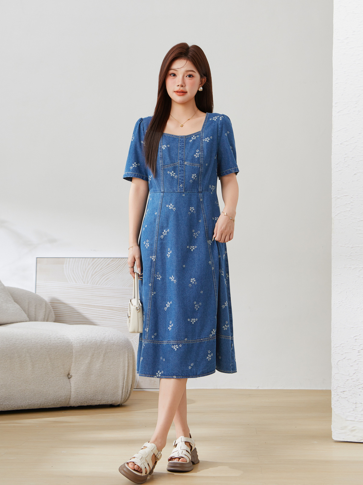 Square Neck Waist-Cinching Denim Jacquard Dress EXQ5515