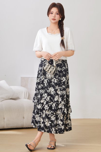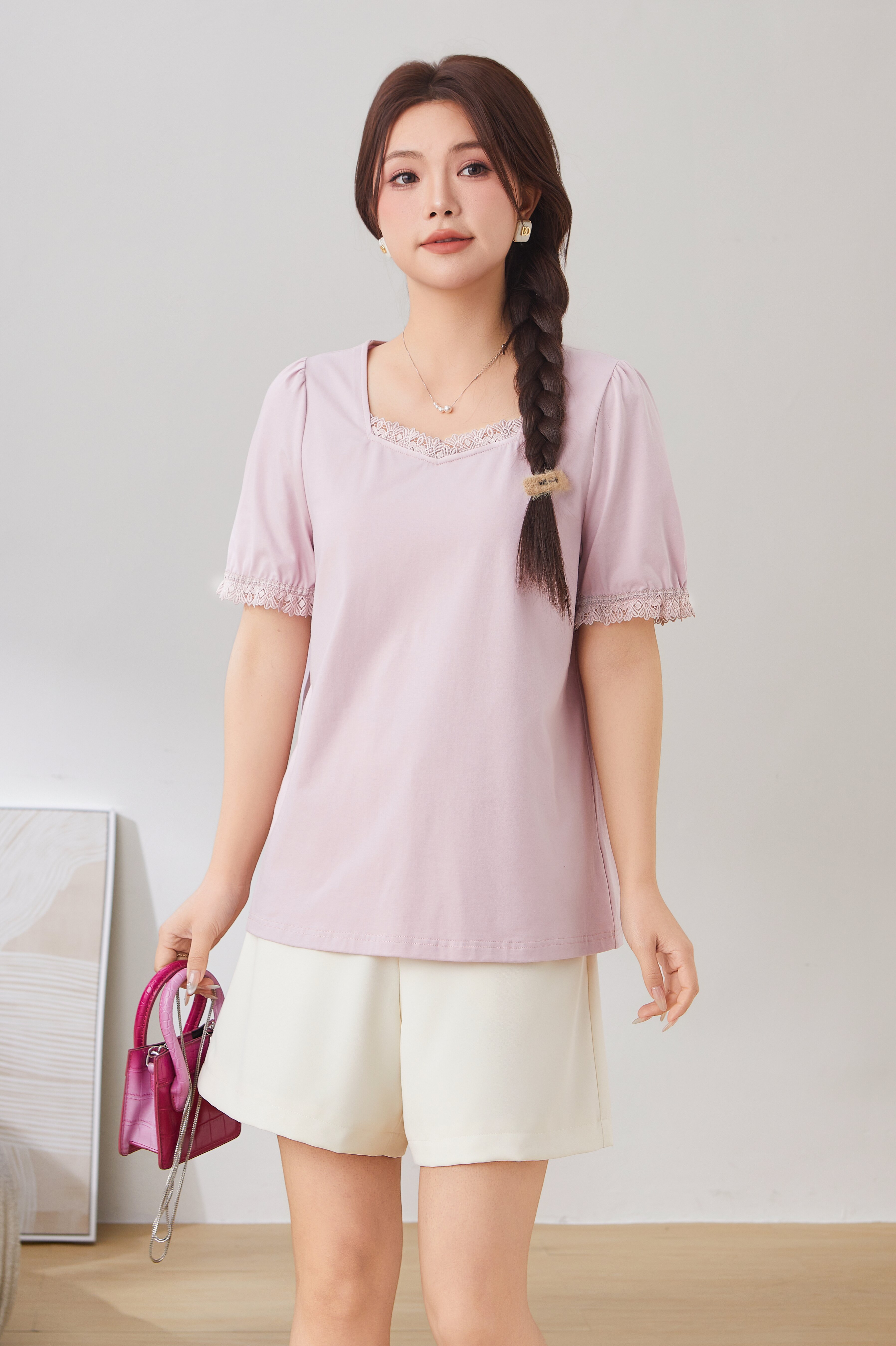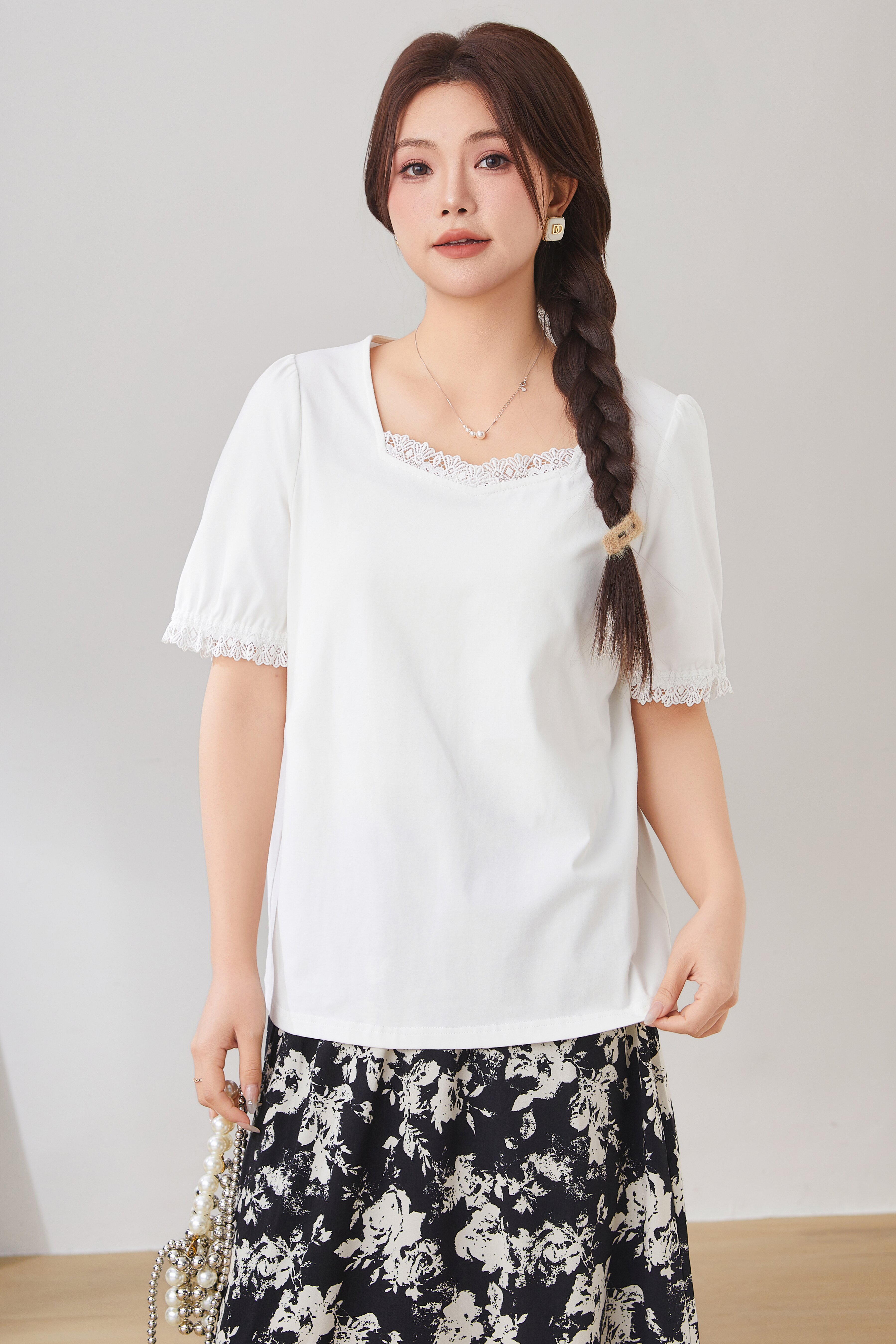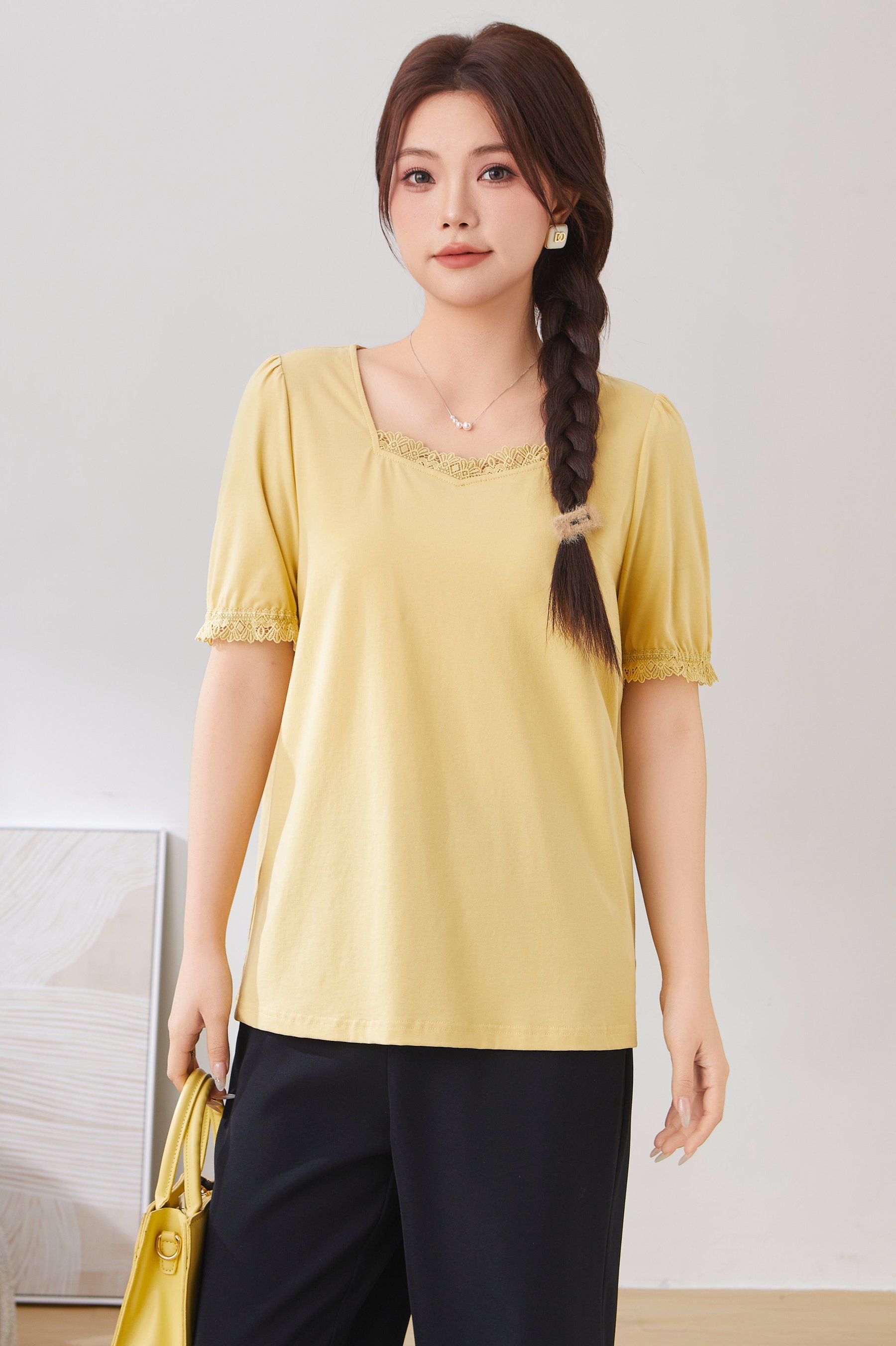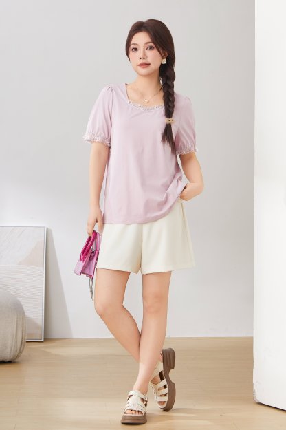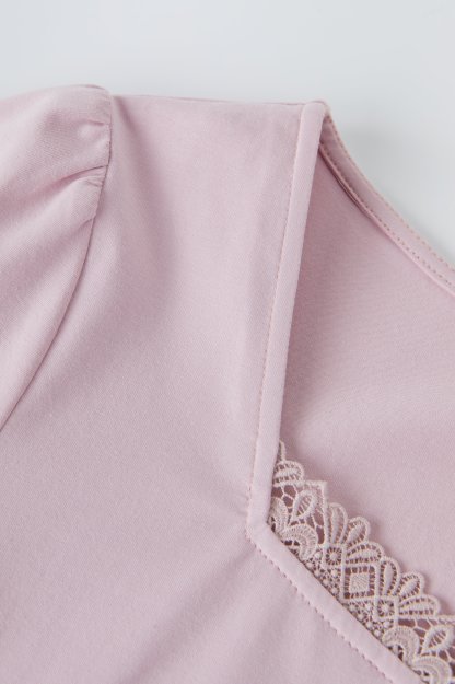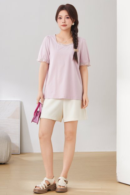 Lace Trim Square Neck Puff Sleeve T-Shirt Top EXZ2931