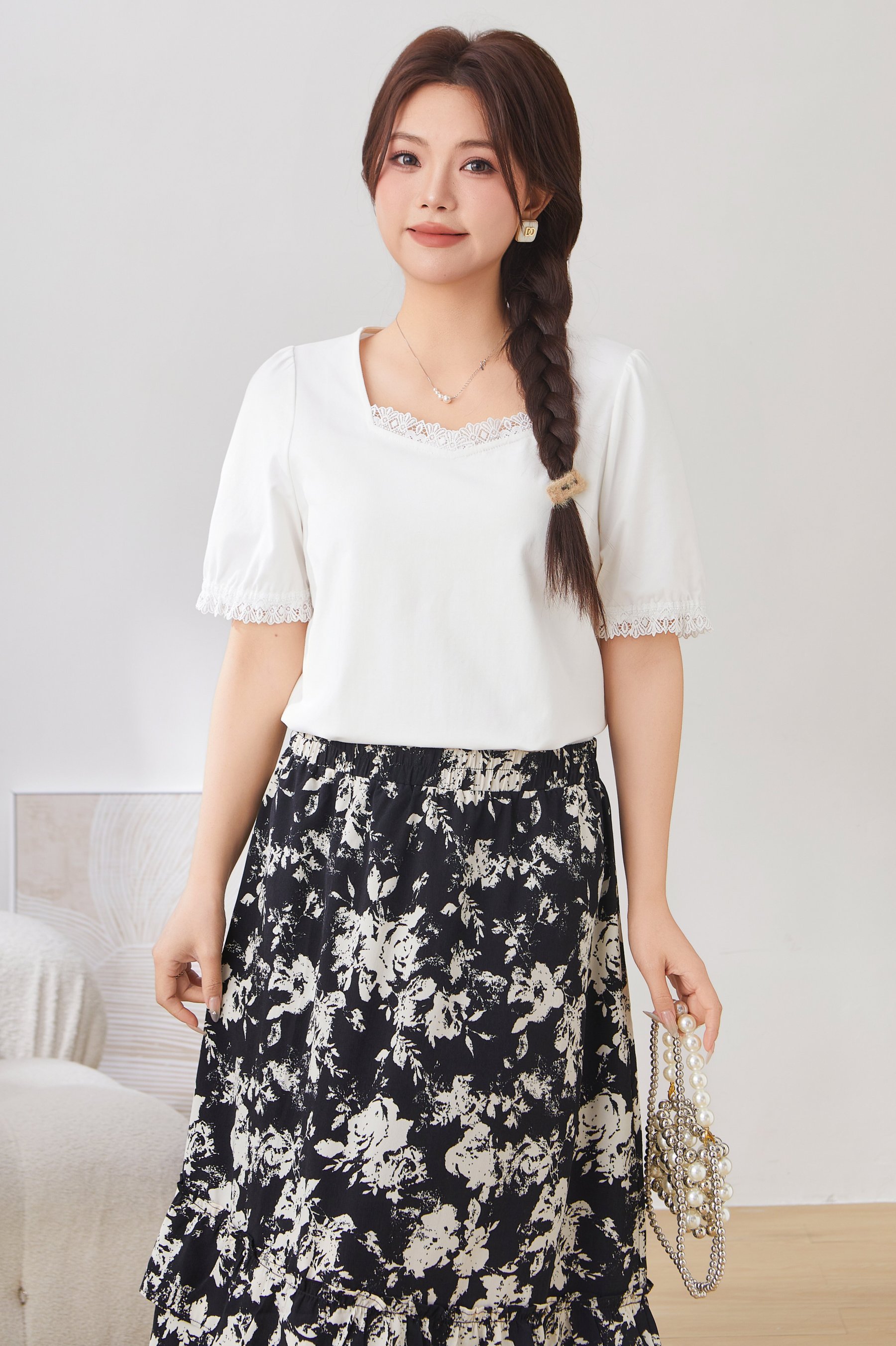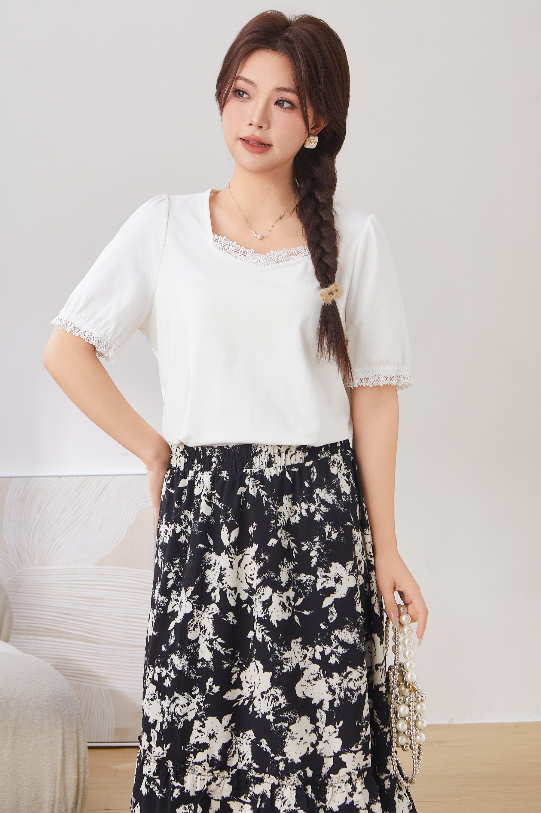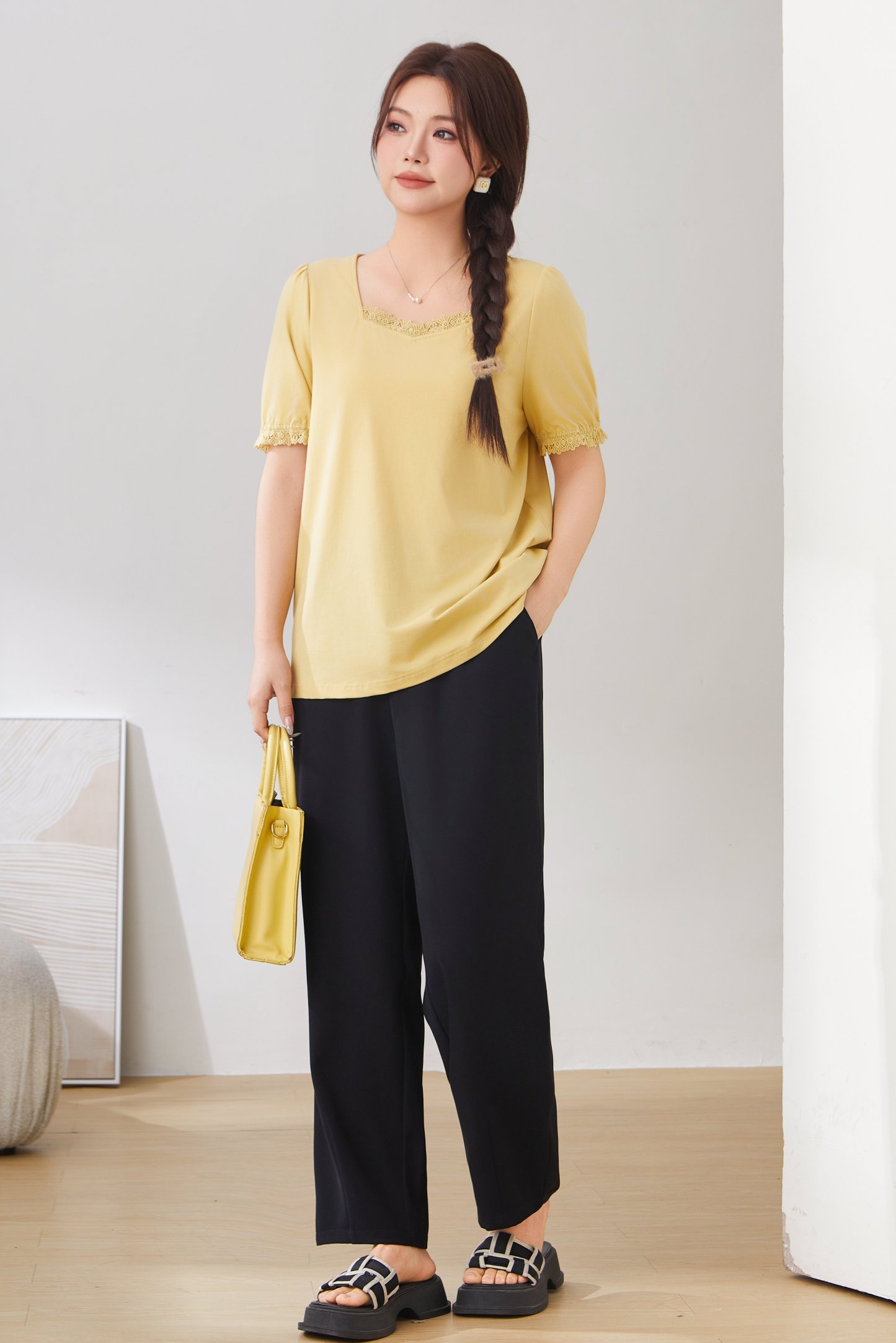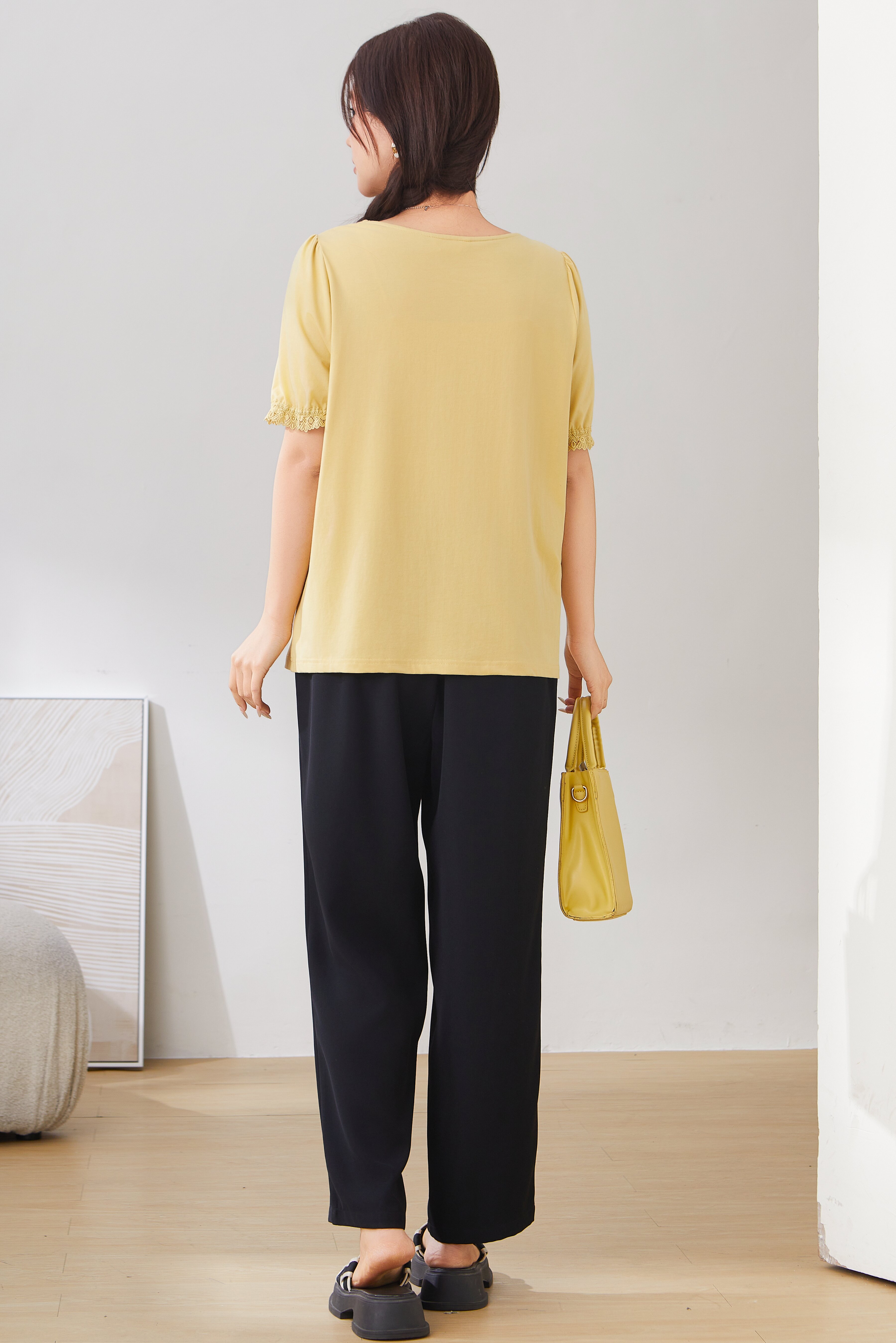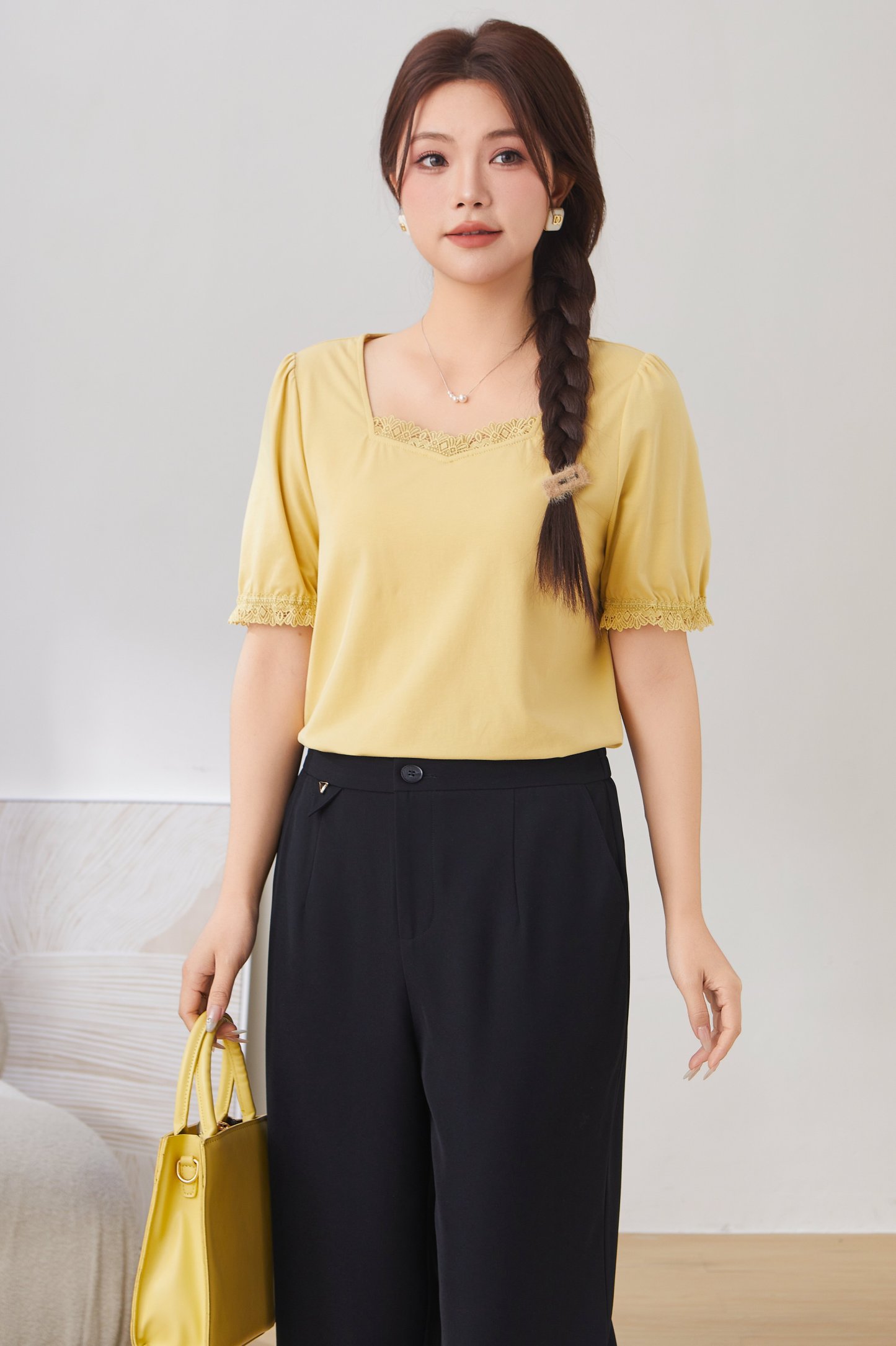 Lace Trim Square Neck Puff Sleeve T-Shirt Top EXZ2931