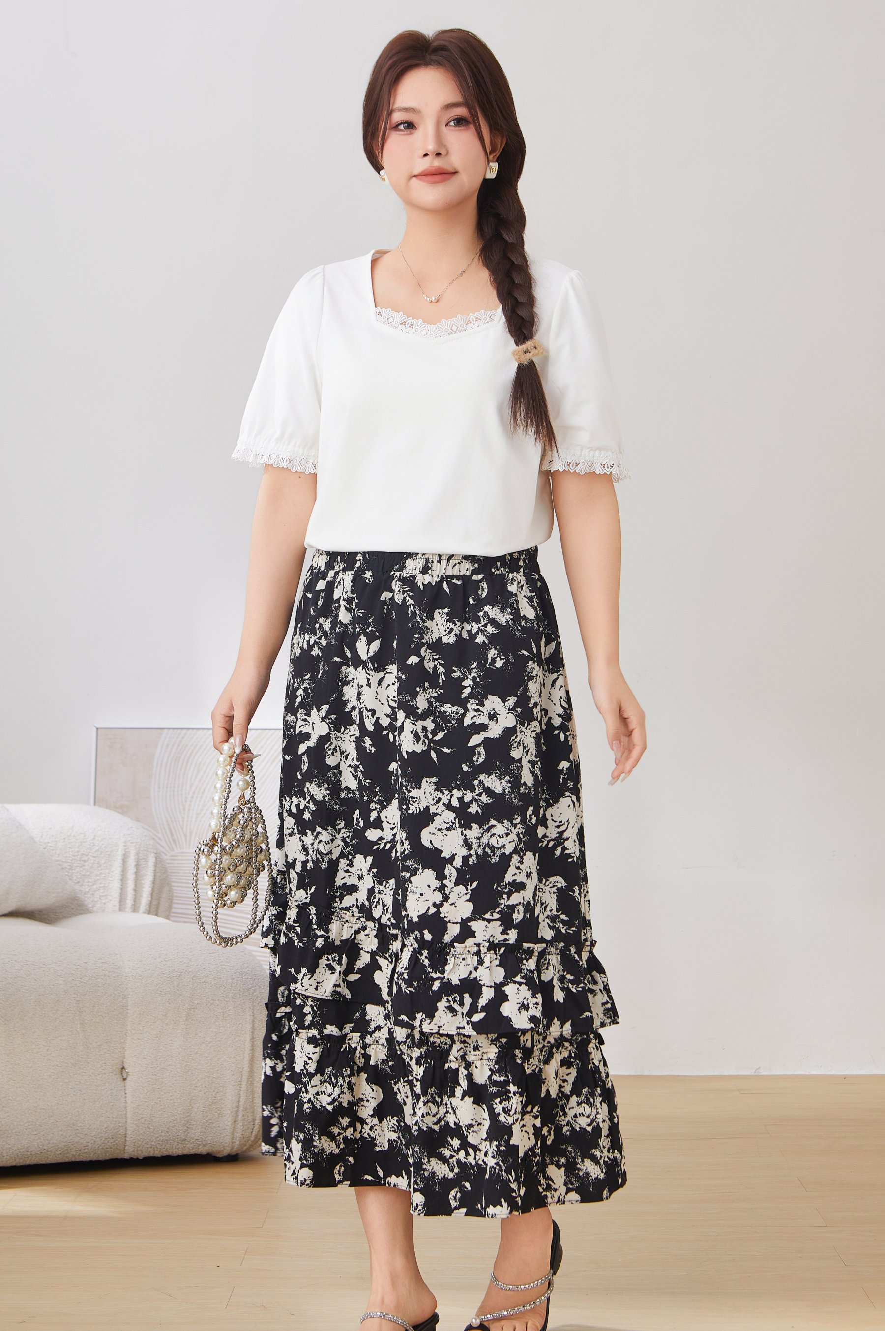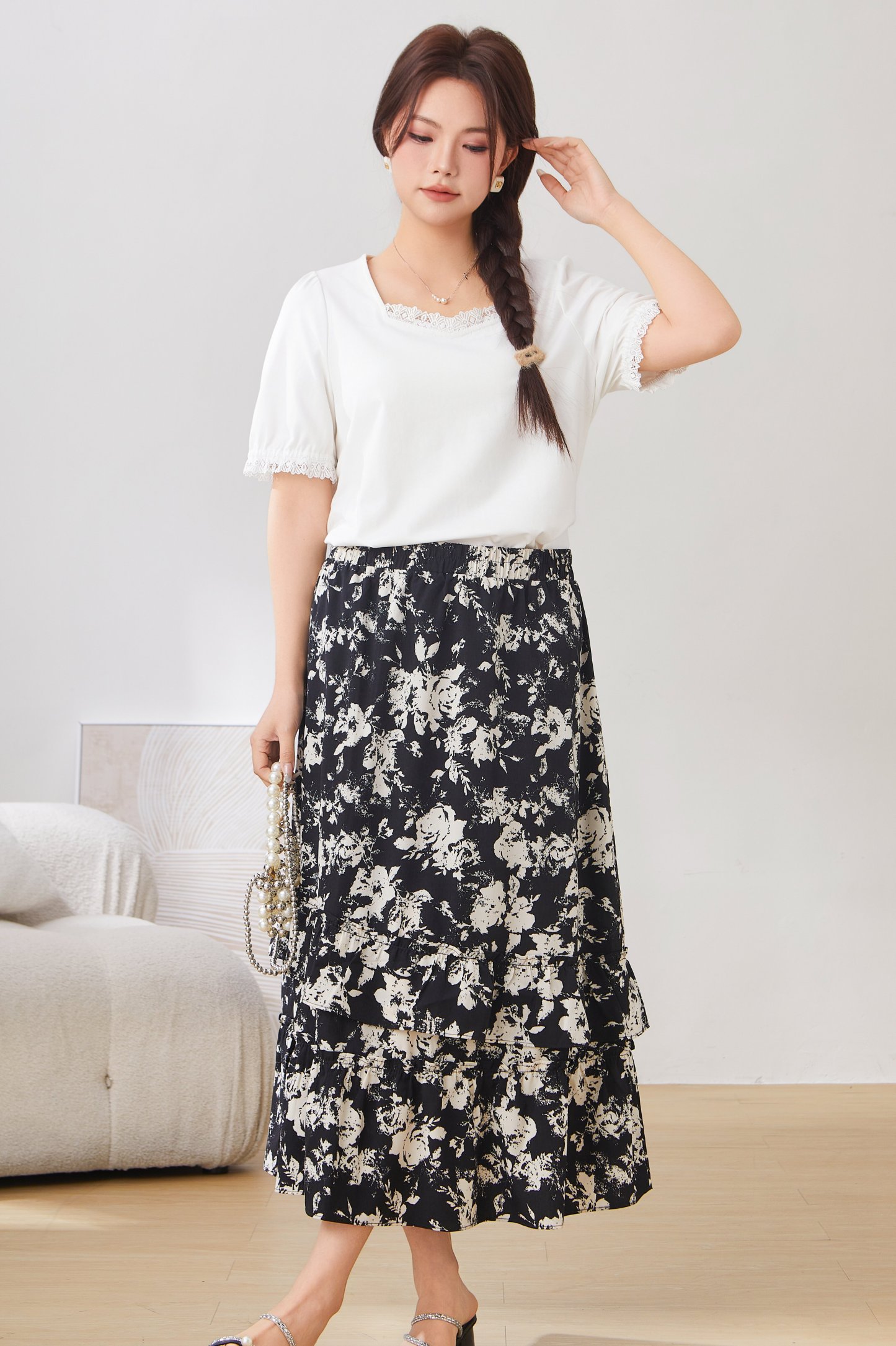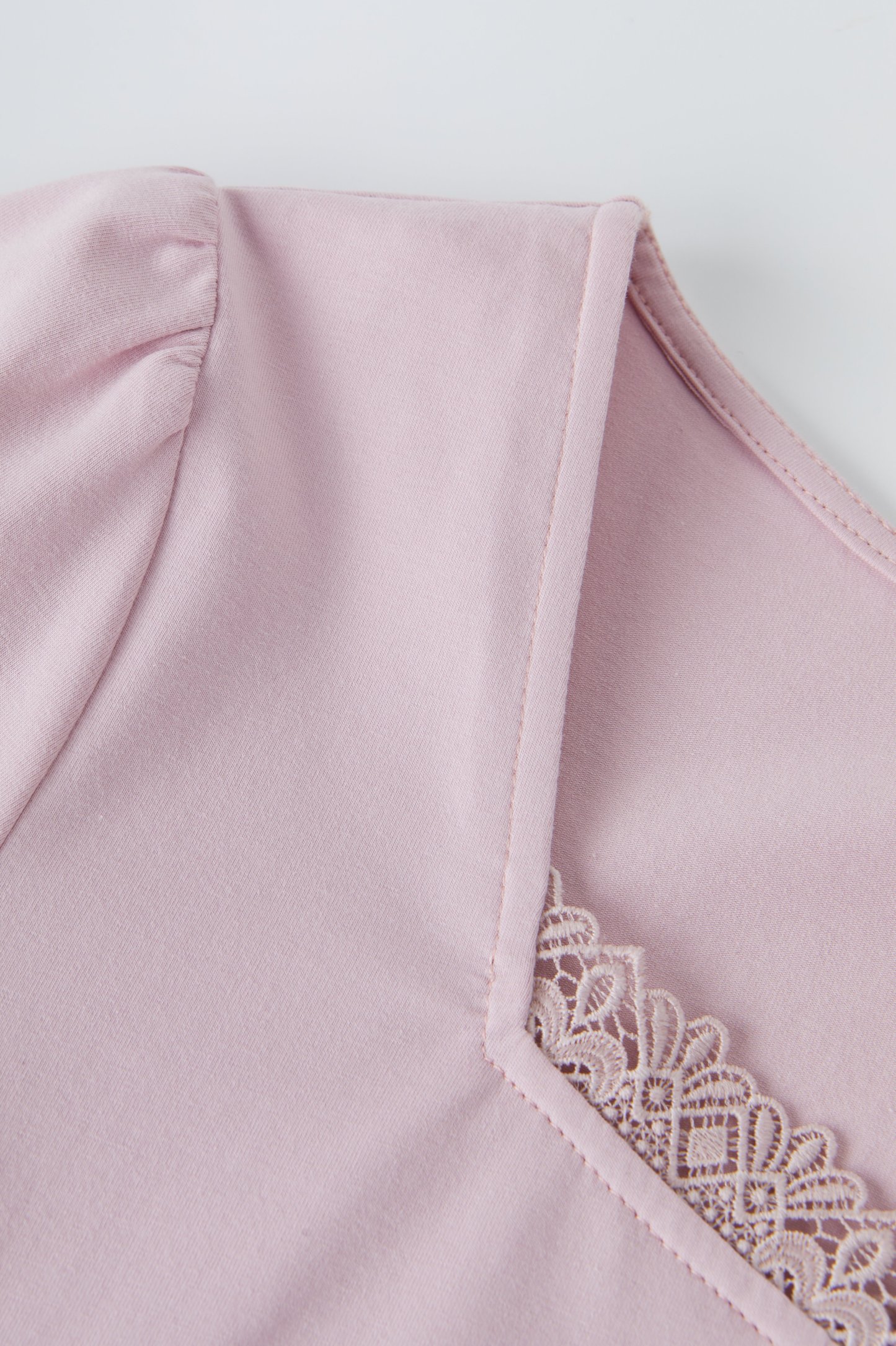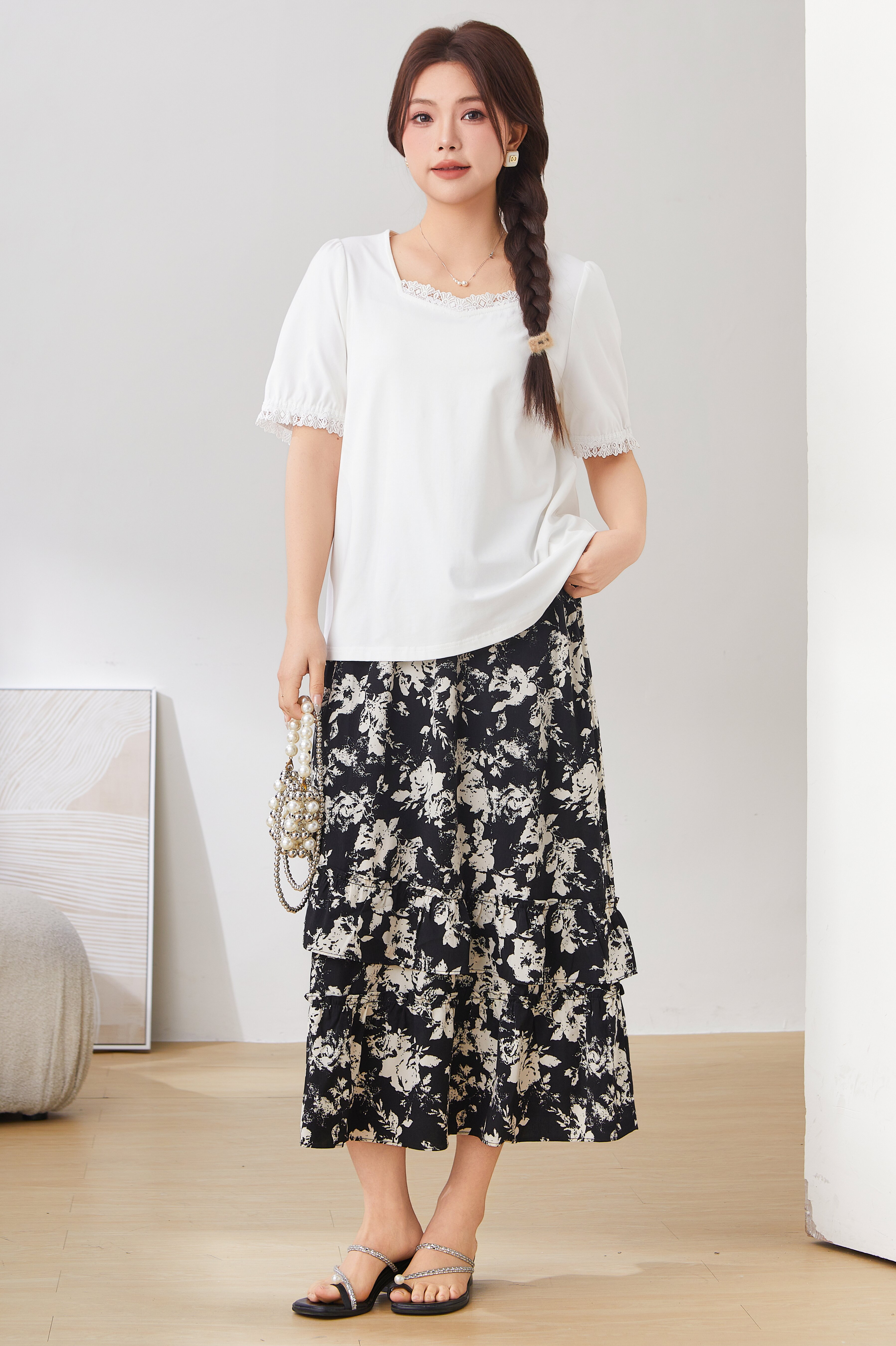 Lace Trim Square Neck Puff Sleeve T-Shirt Top EXZ2931