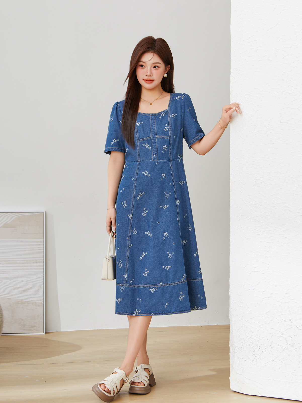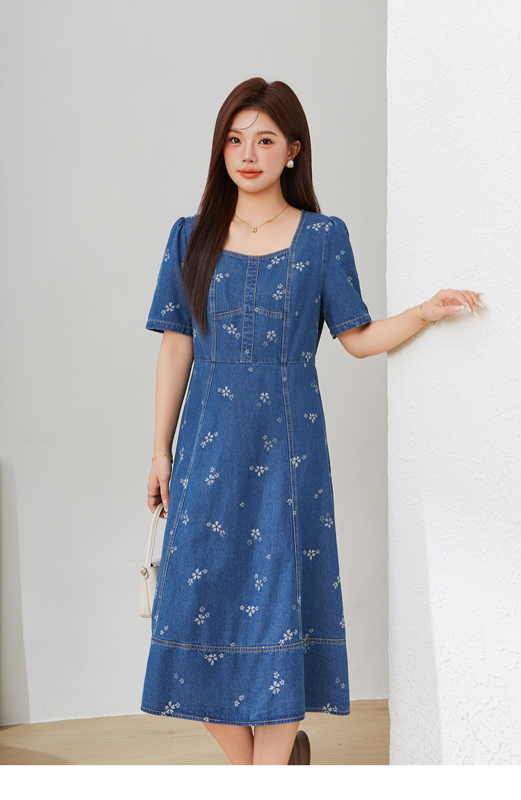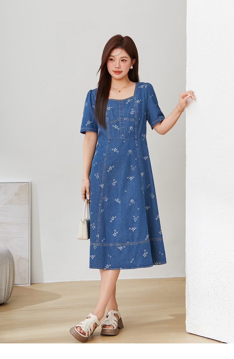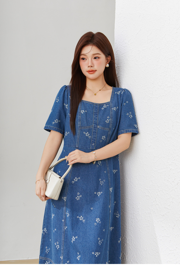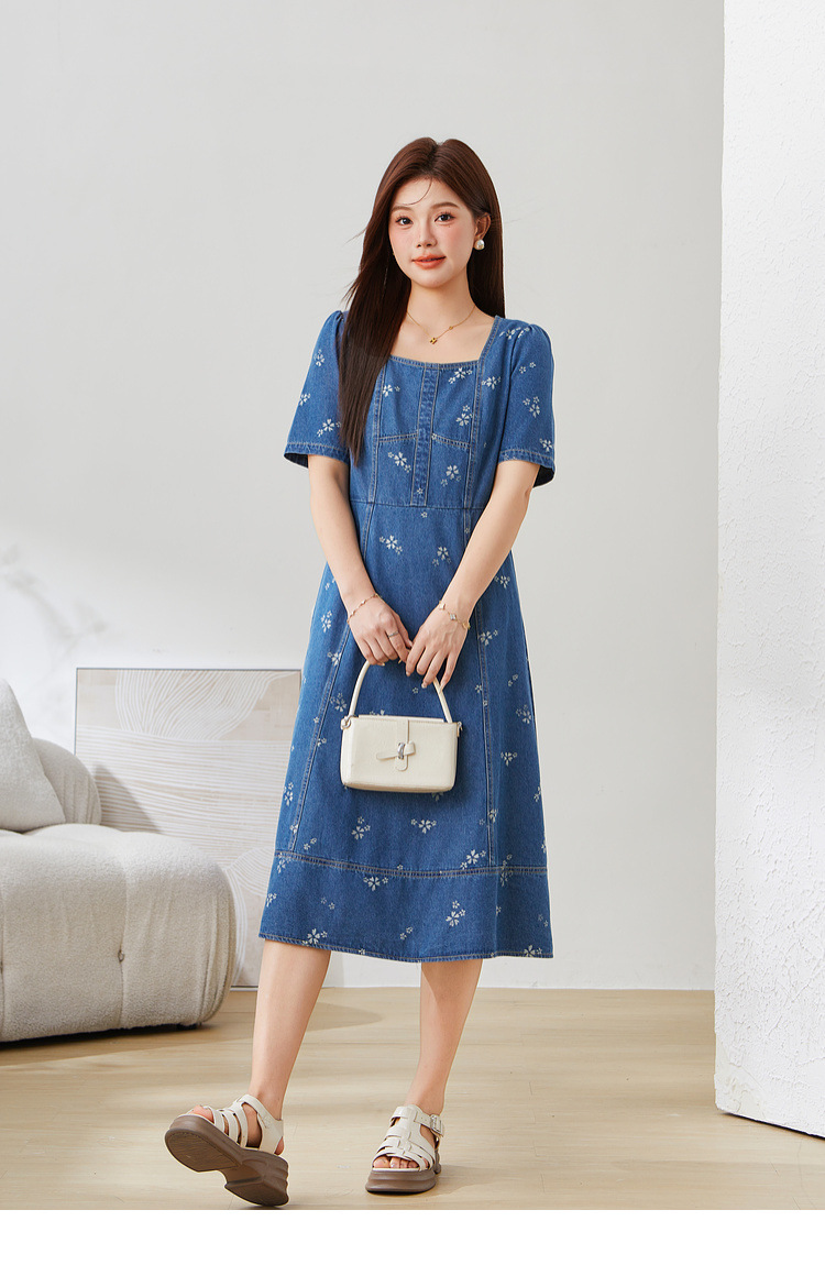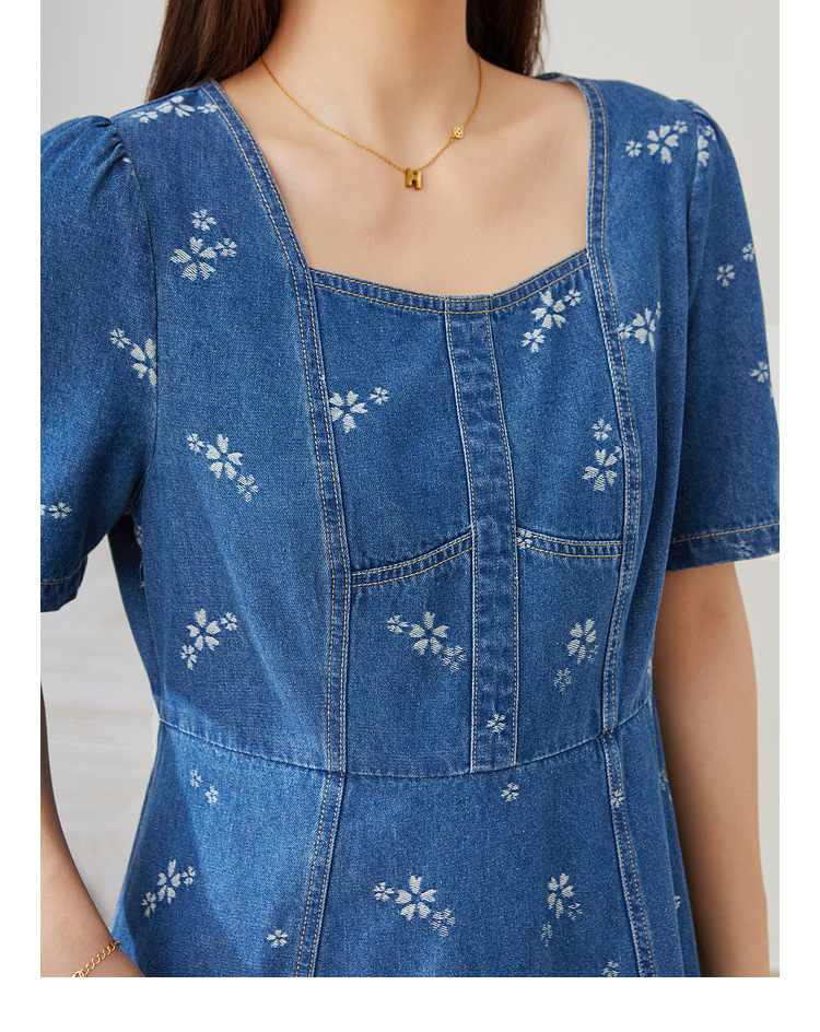 Square Neck Waist-Cinching Denim Jacquard Dress EXQ5515