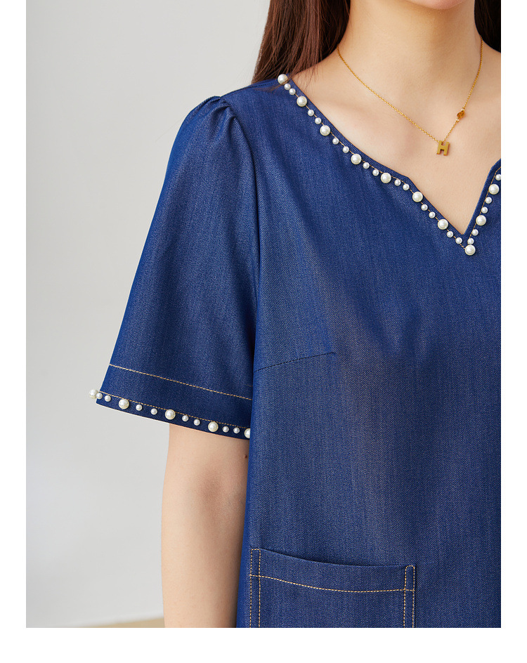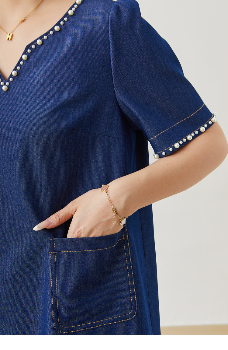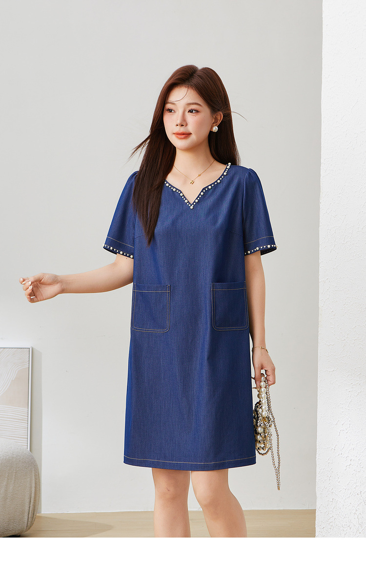 V-neck Heavy Beaded Faux Denim Dress EXQ5381