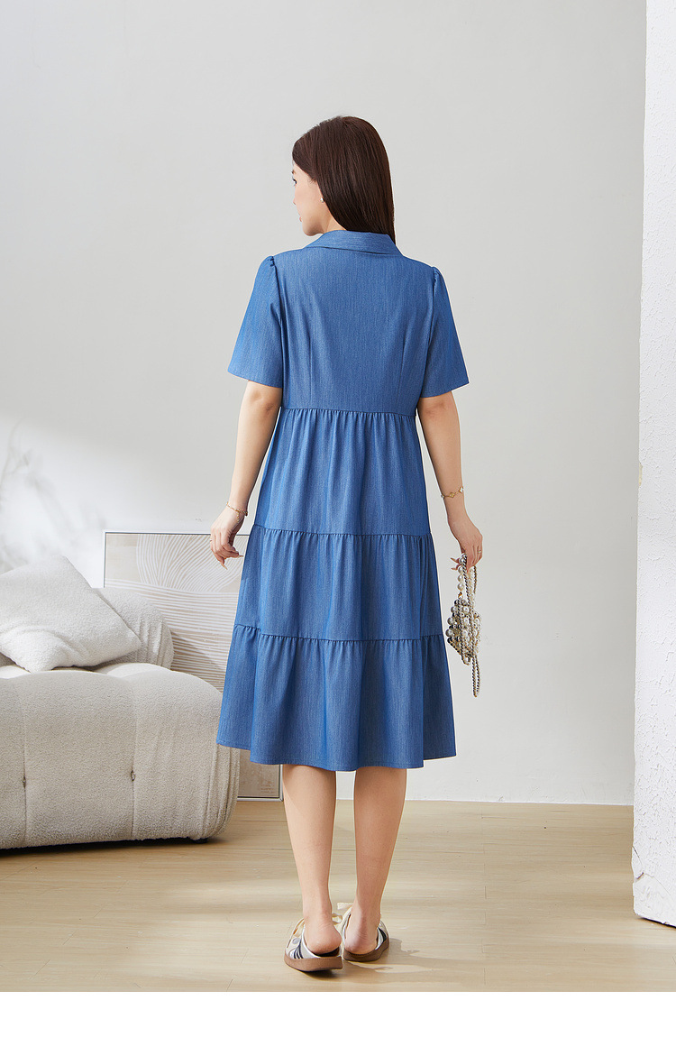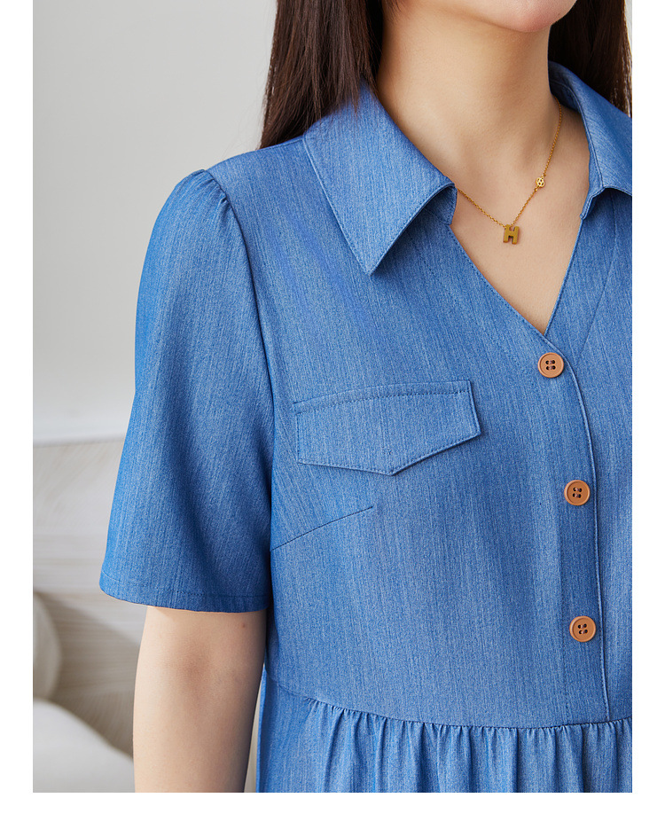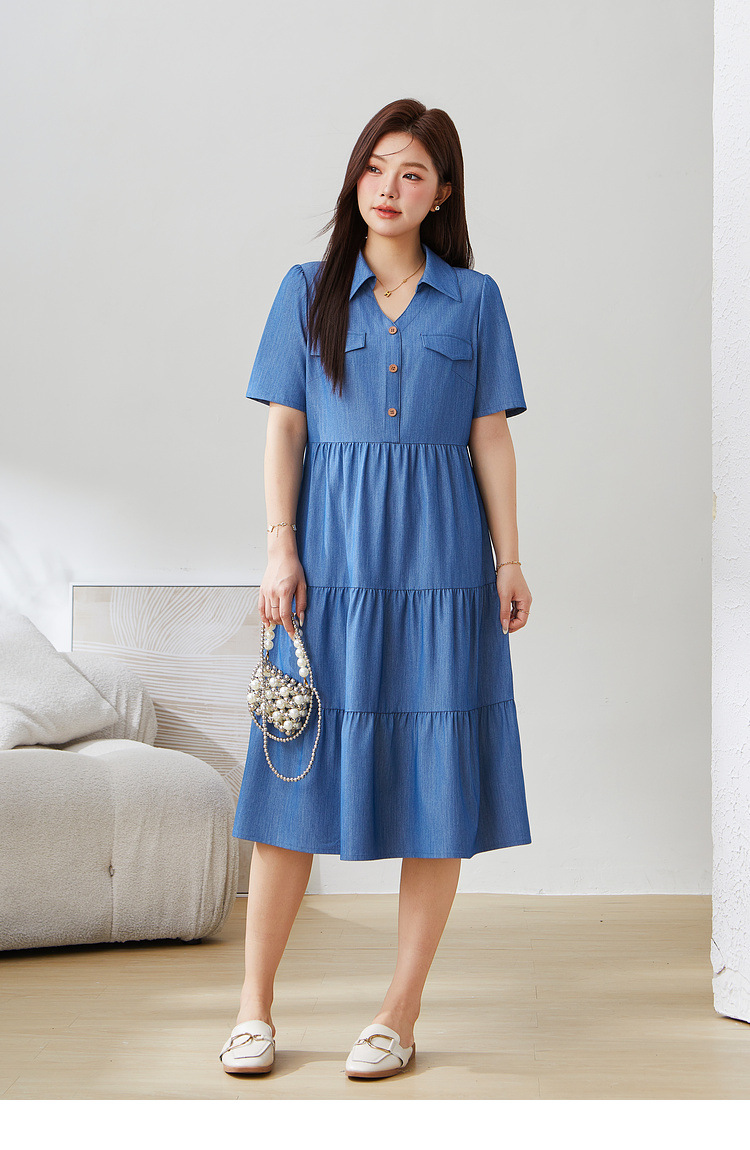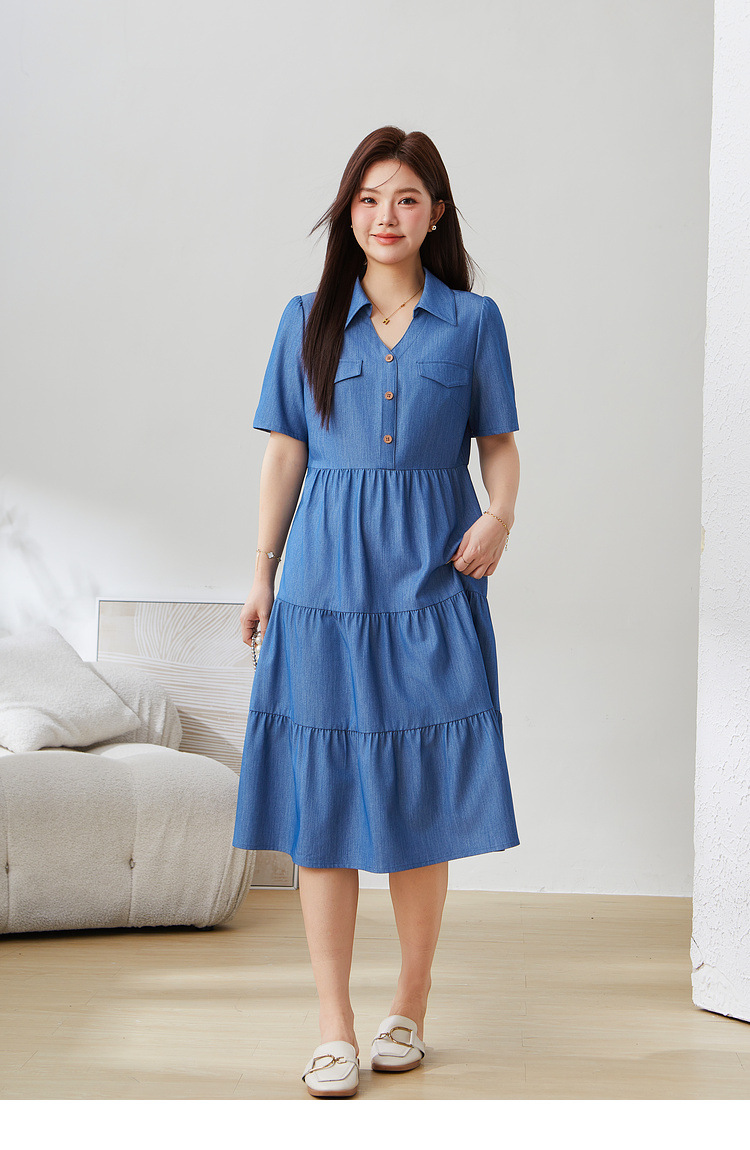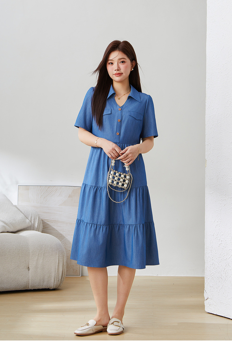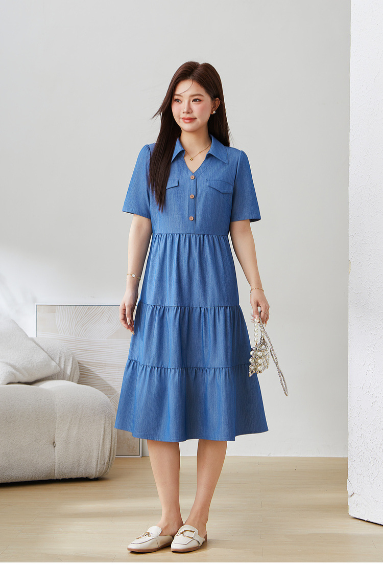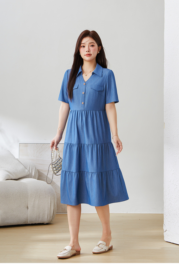 V-neck Waist-cinching Imitation Denim Dress EXQ5235